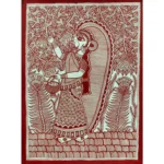This elegant Madhubani artwork captures the serene beauty of a village woman gently gathering flowers from a blossoming tree. Rendered in a striking monochrome red palette, the painting highlights the traditional line-based technique that defines authentic Mithila art.